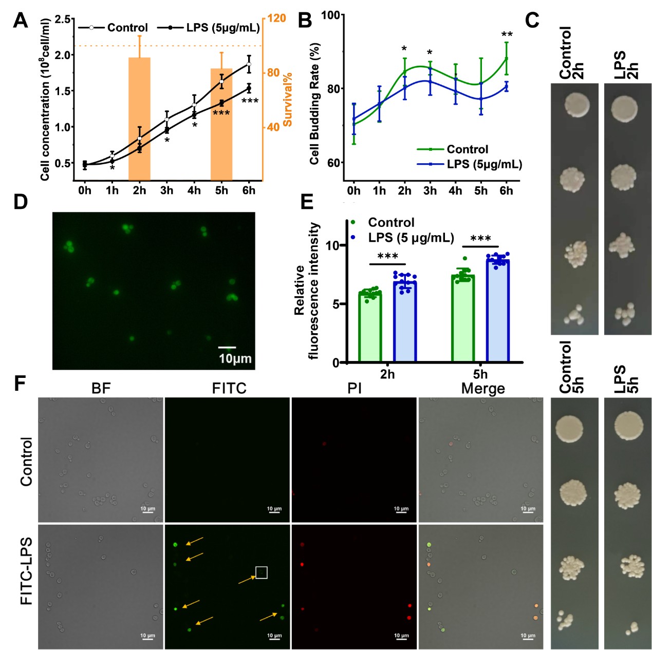 为探究污染物暴露导致特征性VOCs产生的生物学机制,要茂盛团队展开了此次针对细胞释放VOCs的研究。该研究以酿酒酵母(Saccharomyces cerevisiae)为模式生物,酵母细胞与人类细胞在基础代谢通路中存在高度同源性,研究采用脂多糖(内毒素LPS)模拟外界环境暴露刺激。通过生长曲线、细胞活力测定、共聚焦显微镜等实验,清晰呈现了酵母细胞对LPS的应激反应及相互作用(图1)。LPS组与对照组的生长态势、存活率和细胞出芽率和胞内活性氧存在显著差异,直观反映出LPS诱导的细胞增殖抑制和氧化应激。通过分析荧光标记的LPS在细胞内的聚集状态,进一步揭示了细胞受到刺激后的生理变化。