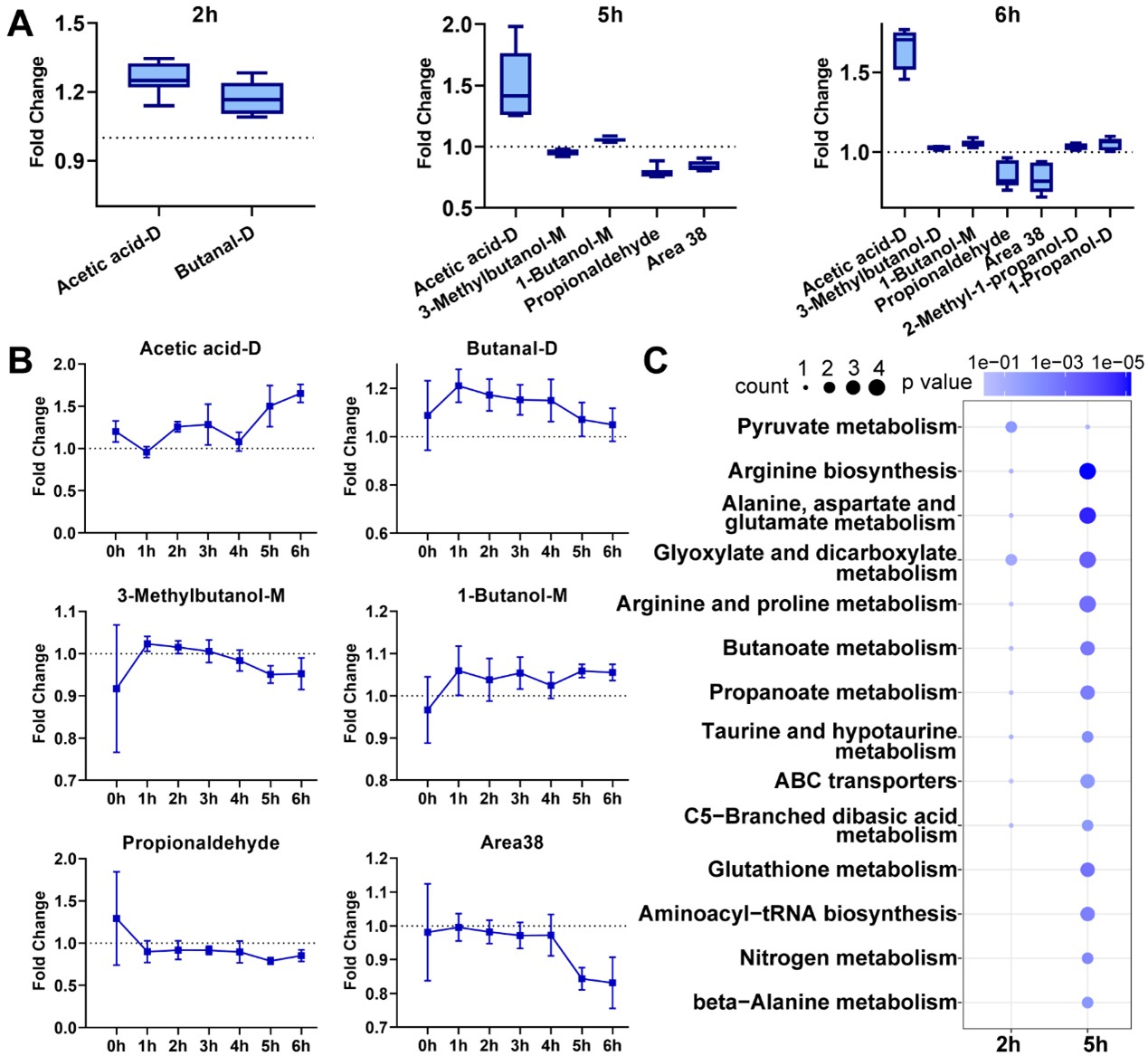 图2 酵母细胞在暴露LPS后VOCs释放及代谢通路的时序分析。