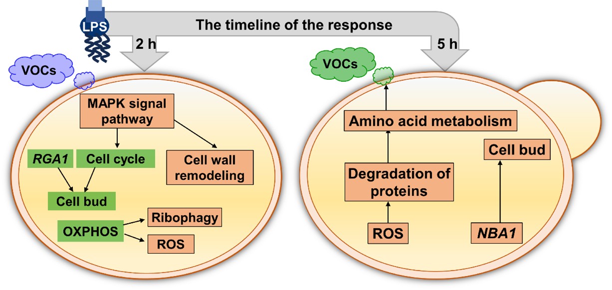 图3 酵母细胞在响应LPS暴露的应激反应和适应反应阶段释放特征性VOCs的分子机制。